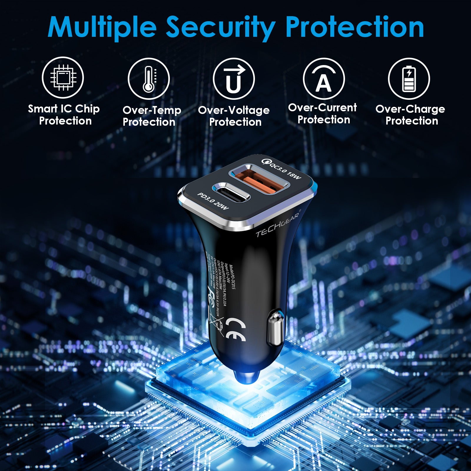 TECHGEAR 38W USB C Car Charger 12V/24V [PD 20W + QC3.0 18W] Dual Port Fast Charging Cigarette Lighter USB Adapter for Mobile, Tablets, Gaming Devices etc
