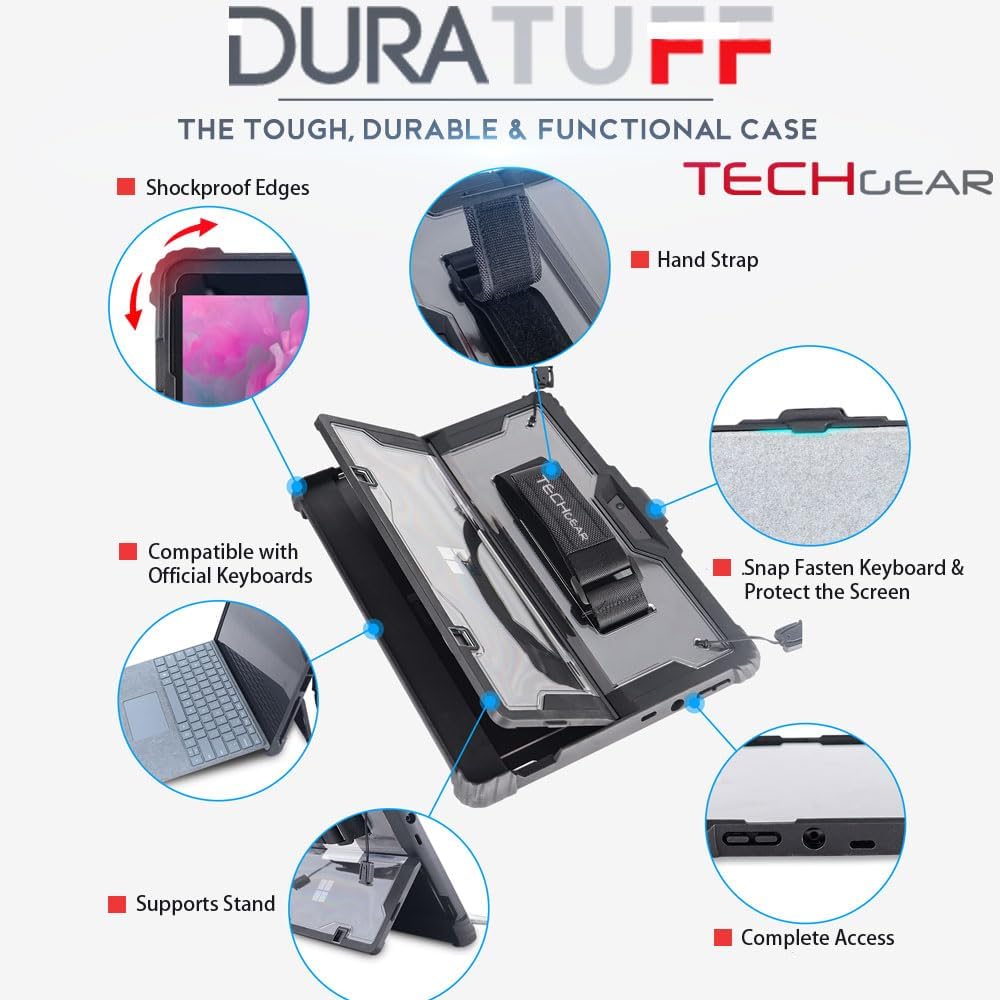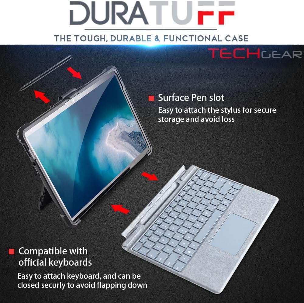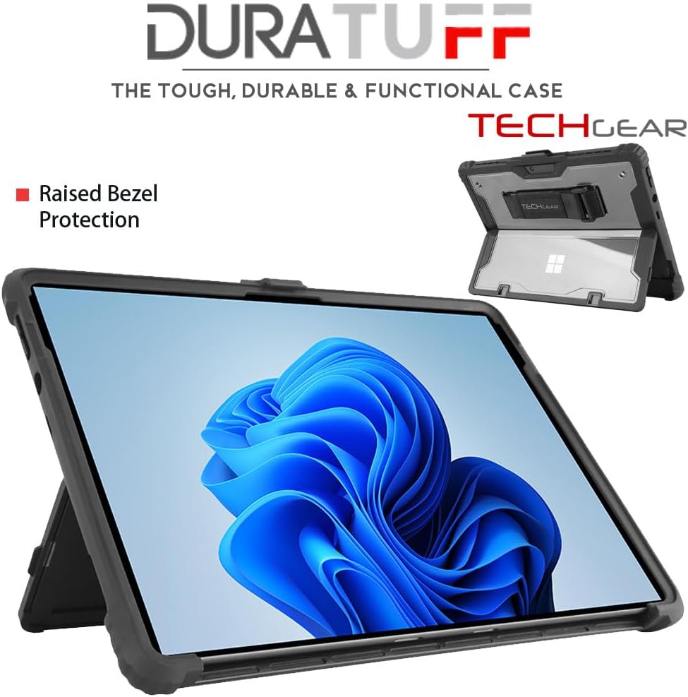 - [Surface Pro 8 Tough Case] The TECHGEAR DuraTUFF Case is a multi-layer protection, full body hybrid defender case. There is an inner tough clear hard poly-carbonate shell, a rugged shock resistant drop proof outer bumper cladding and a raised screen bezel. Extra cushioning on the corners provides your tablet with max protection. This smart design case is extremely ideal for indoor our outdoor use for work, home and children.