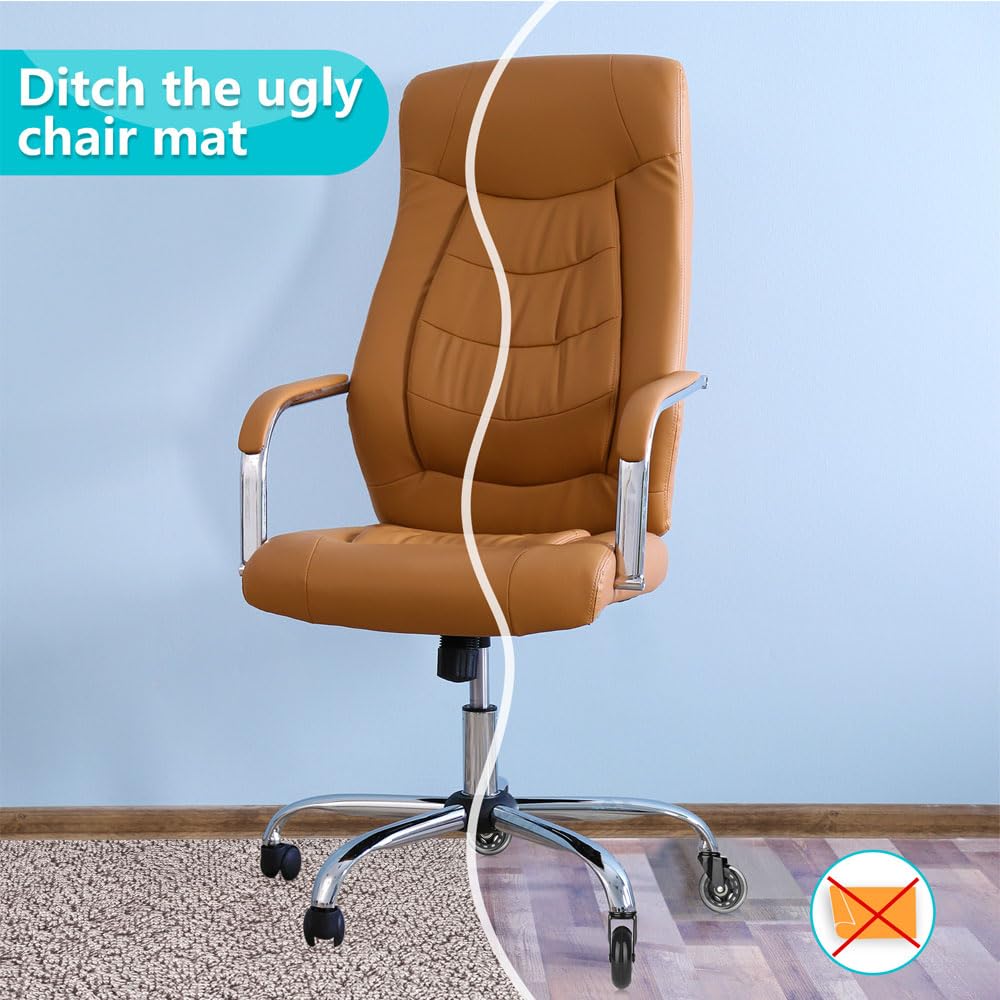 - KEEP YOUR FLOORS IMMACULATE: You can now throw away your old office chair mats and get ready for some serious, smooth and quiet rolling across the floor. With an almost velvety feel, these unique office casters can safely glide on your expensive hardwood flooring or tile, vinyl, carpet and any type of floor with unparalleled ease, without causing the least scratch or noise and keeping your floors immaculate. Enjoy a carefree, safe glide. (Not recommended for thick/fluffy carpets)