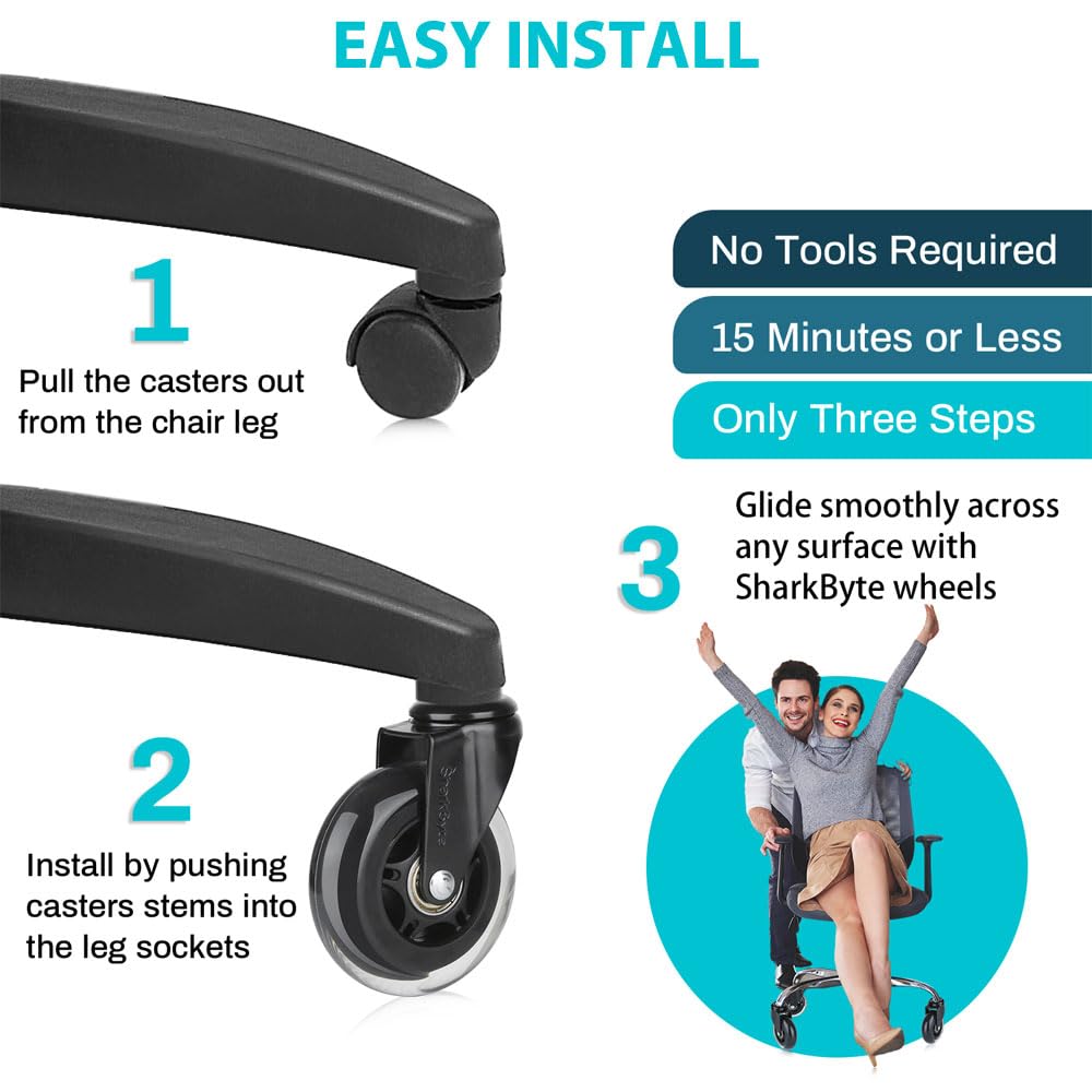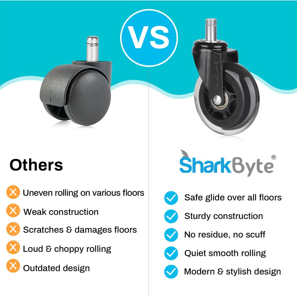 - DURABLE & ROBUST: Not all office chair castors are created equal. With the entire support bracket and all internal parts made of superior grade steel, precision ball bearings, as well as top quality Polyurethane rollerblade style swivel wheels, designed to be super gentle with your precious flooring, these efficient caster wheels promise to last a lifetime. These SharkByte chair castors can support loads up 552 pounds (250kg)!