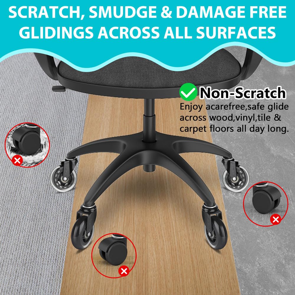 - SMOOTH & SILENT GLIDING: A squeaky, rickety office chair wheels is a telltale sign that they’re cheap and poorly made. You’ll slide and glide around in total silence with our rubber rollerblade style castor wheels.