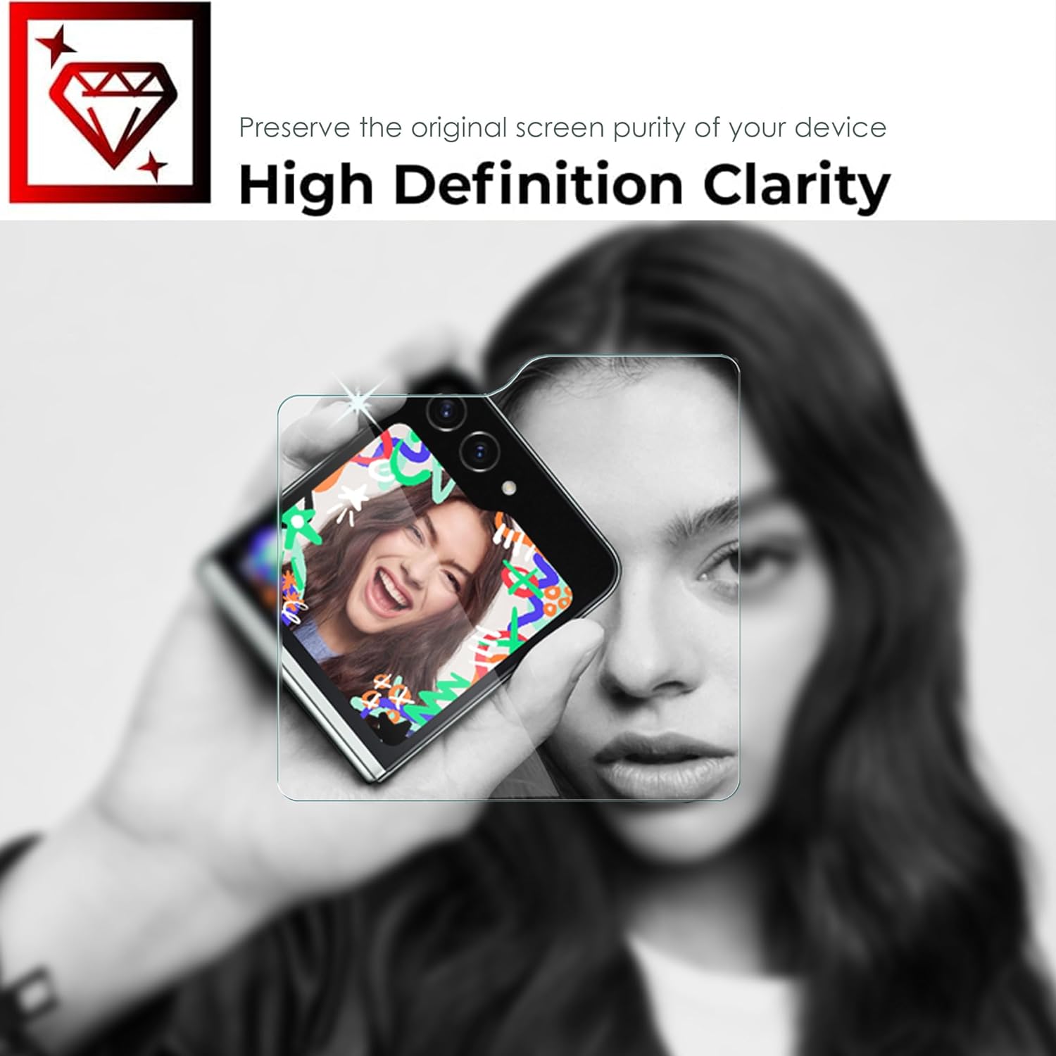 - UPGRADED VERSION: Upgraded and Custom made Tempered Glass Screen Protectors for the Samsung Galaxy Z Flip 5 5G front display. (NOTE: The protector does not cover the entire screen to enhance compatibility with most phone cases)