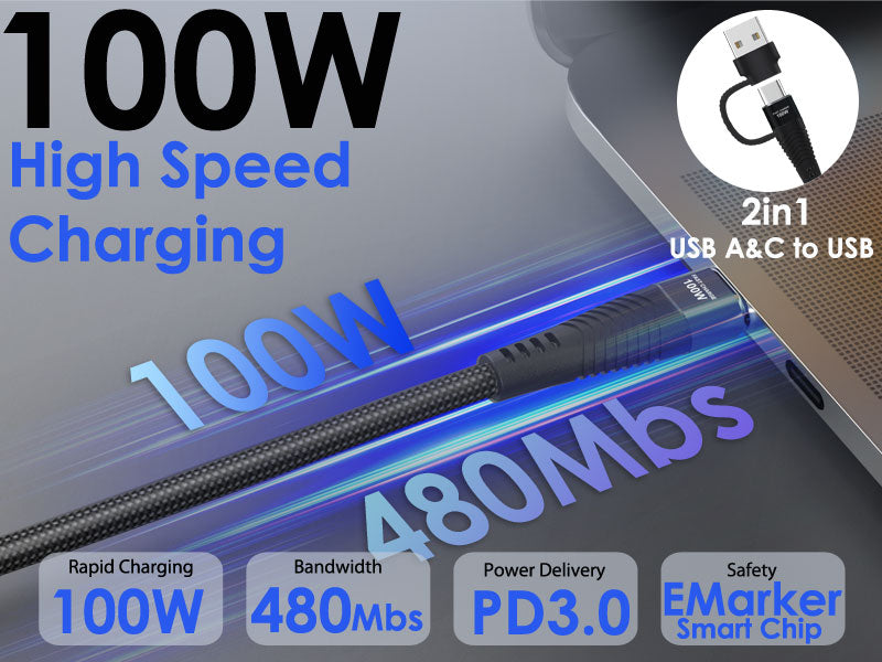 Delivering up to 100 W PD 3.0 / QC 4.0 charging and 480 Mbps sync speeds, it powers and transfers between laptops, tablets, and smartphones seamlessly. The built-in E-Marker chip ensures precise current control and device protection, while the tangle-free nylon braid and aluminium connectors guarantee a long lifespan.