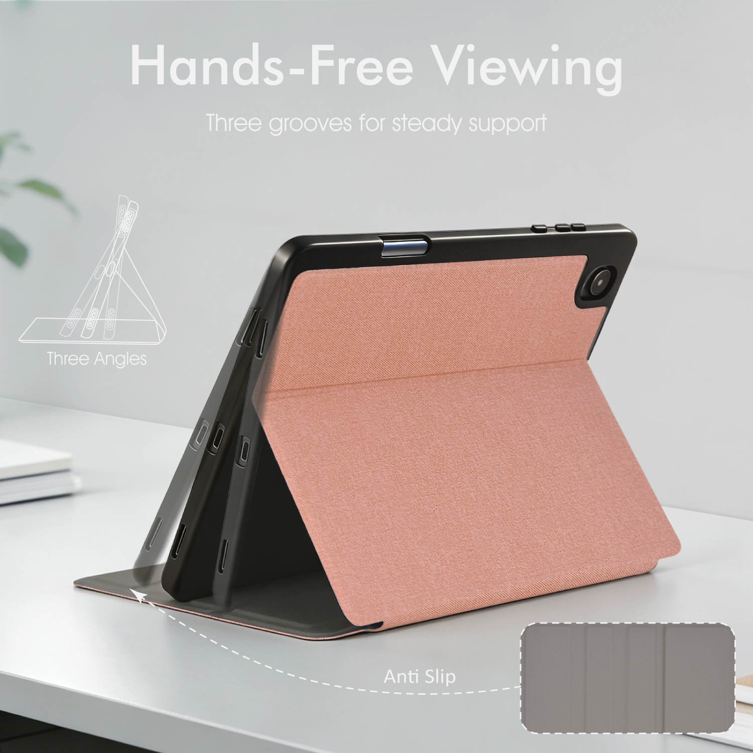 The foldable front cover converts into a stable stand, supporting comfortable angles for typing, reading, video calls, presentations and media streaming.