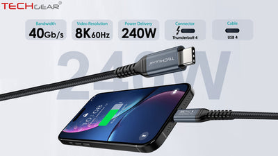 TECHGEAR USB4 Gen 3 (Thunderbolt 4/3) Cable 240W PD3.1 40 Gbps Data 8K Video – E-Marker, Nylon Braided – 0.3 m | 1 m | 2 m