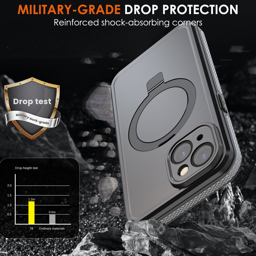 Integrated magnetic ring ensures secure alignment for MagSafe wireless charging while also functioning as a stable kickstand for portrait or landscape viewing.
