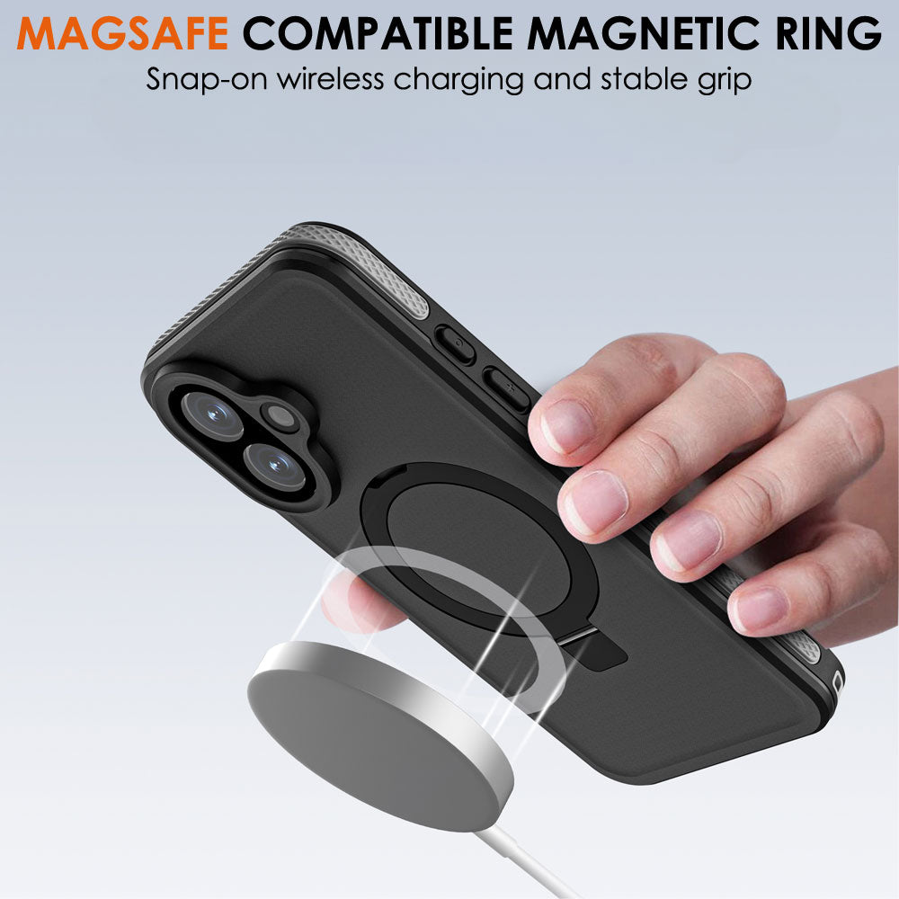 Integrated magnetic ring ensures secure alignment for MagSafe wireless charging while also functioning as a stable kickstand for portrait or landscape viewing.