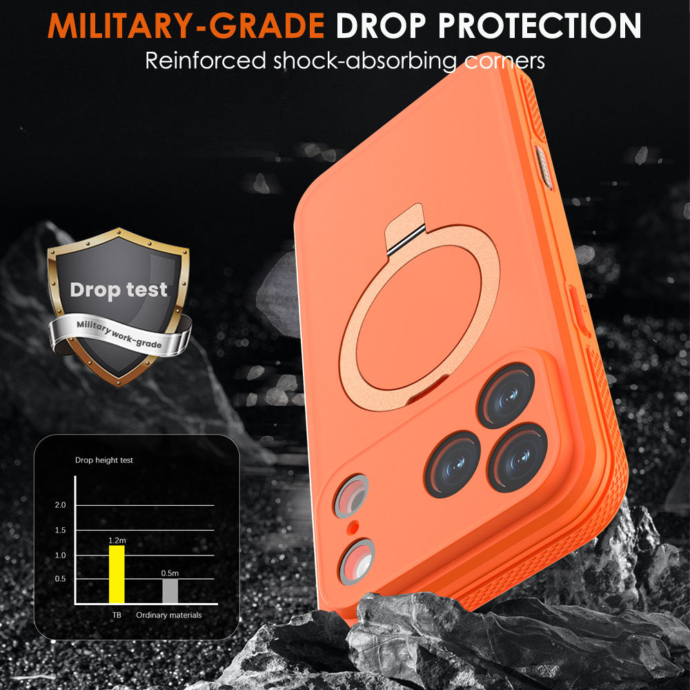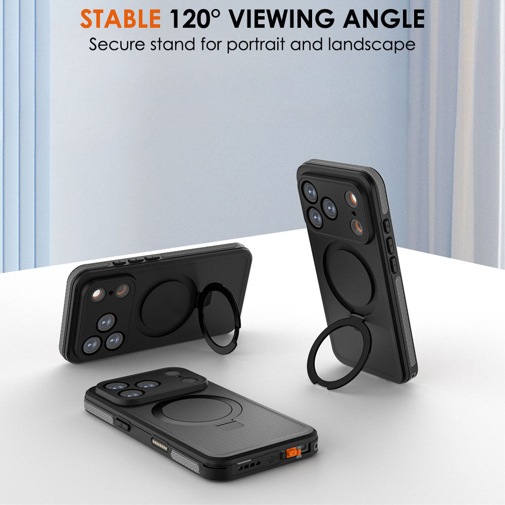 Integrated magnetic ring ensures secure alignment for MagSafe wireless charging while also functioning as a stable kickstand for portrait or landscape viewing.